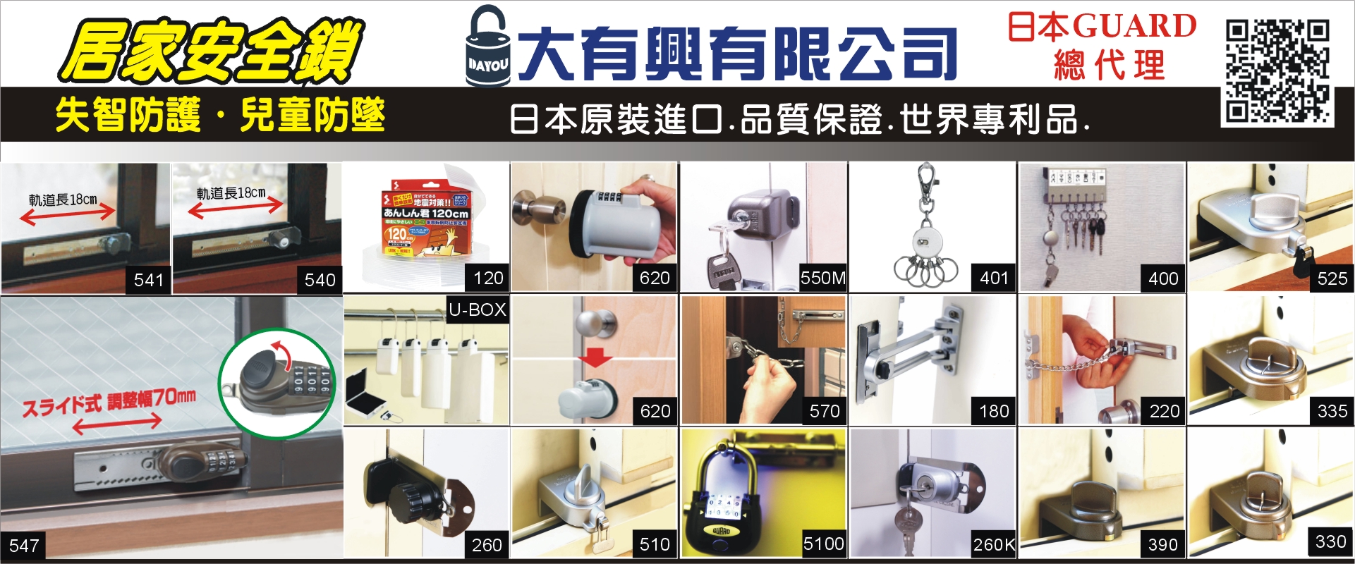 安全鎖、兒童防墜安全鎖、房門安全鎖、鋼珠滑軌、鉸鏈、鋅合金把手、外推窗安全鎖、窗用安全鎖、防開暗鎖、拉門滑輪、防墜安全鎖、鋁窗防盜鎖、門窗輔助鎖、夜光鎖、球型門把鎖、密碼鑰匙兩用鎖、單顆取手系列、防震板、展示收納盒、展示架、傢俱用五金、總代理進口日本GUARD多項專利商品、日本鋁門窗安全鎖、拉門安全鎖鑰匙型門鏈鎖、旅行鎖、可調式安全門扣、內開門可調式安全門扣、外開門可調式安全門扣、磁力鑰匙圈、磁力鑰匙保管架、U-BOX密碼保管盒、鑰匙密碼兩用鎖、磁力眼鏡鏈、優質台製商品、多種鋼珠滑軌、衣櫃滑輪、居家安全、兒童防墜鎖、日本GUARD總代理、台中安全鎖、台中兒童防墜安全鎖、台中房門安全鎖、台中鋼珠滑軌、台中鉸鏈、台中窗用安全鎖